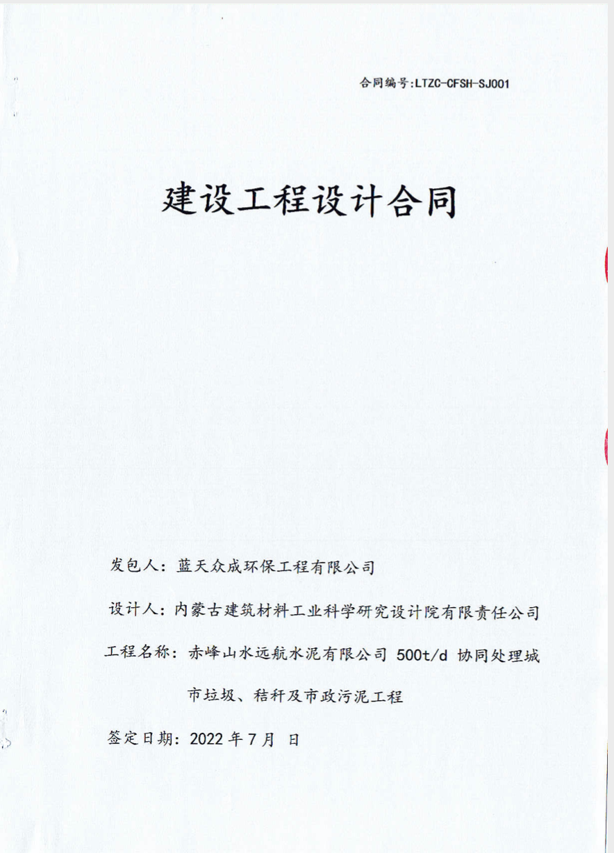 签订赤峰山水远航水泥有限公司 500t/d 协同处理城市垃圾、秸秆及市政污泥工程合同